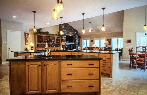 Our home has four bedrooms plus a huge loft, 3 1/2 baths, a huge kitchen/'living area with all updated appliances and a totally outfitted chef's kitchen. There is dining space for 10 at two tables close to one another and with views of Village Lake. There is also a bar which seats another eight persons. You will enjoy the stone fireplace (with a 70 inch smart TV over the fireplace) in the central gathering area as well as a fireplace in the oversized master bedroom. The master bedroom also has double vanities,a jetted tub and separate large walk in shower area. It is separated from the other three bedrooms and offers privacy and quiet. The home is heated by radiant in-floor heat, and at 7500 feet above sea level, it does not generally need air conditioning. There is a FROG room (finished room over garage) with TV and ping pong, There is a queen sized bed in this room (the old air-conditioned room in the house) with an cabinet closet, and a writing desk. All three garage spaces are available for your vehicles. We also have a Corn-hole game available for the fenced in (split rail fence with heavy gauge wire) backyard. Our home offers wireless internet throughout, five TVs with Dish, Netflix, Amazon Prime and otters streaming channels all in a warm atmosphere designed for an extended family gathering. The sign over the door says "Friends and Family Gather Here" so if that is your goal for your next holiday time, we hope you will choose this spacious and luxurious atmosphere for gathering your family and friends together. We desire for you and your friends and family to make special memories in a family getaway that is in a safe and beautiful setting.
