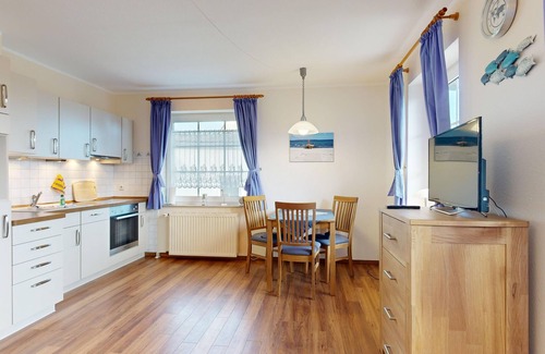 Equipment of the apartment on the ground floor (40 m²): * Living room: sofa (sleeping 1-2 people), satellite TV, radio with CD, Wi-Fi Internet * Kitchen: Modern kitchen with dishwasher, ceramic hob with oven, microwave and Dining area * 1 bedroom with a double bed * 1 bathroom with shower / WC Outside: * large garden with sandpit * terrace with garden furniture * bike shed * parking space on the property. Other: * In the season minimum rental period 7 nights * New Year's minimum rental period 5 nights * Non smoking apartment * Pets on request (fee) Additional costs when booking or on site: * linen package * pets once 50, - € * tourist tax