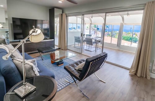 Experience San Diego like a local and enjoy ocean views all day long at The Artist's Studio in Sunset Cliffs. With floor to ceiling windows on the entire West side, this delightful 2nd story home will inspire your creative side with its breathtaking views of the Pacific Ocean. March of 2021, a full remodel was completed on this charming studio. You will feel relaxed in this tranquil space with driftwood color vinyl plank flooring, recessed lighting, and contemporary decor. The living room has an extra large 76 inch flat screen TV. The all new fully equipped kitchen is open to the living room and convenient for cooking and eating meals at home. Sliding glass doors open to a large, bright indoor patio space with 11 opening windows, a large table for dining with a view and/or use it as a large work table/desk. There is also a comfy chair, queen bed and both rooms have blackout curtains.