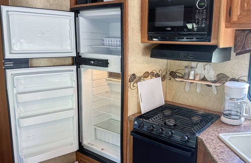 Cozy and fully equipped, the professionally decorated 32-foot Dutchman Coleman camper has a private bedroom with a queen size bed; bathroom with shower and small tub; kitchen with stove, oven, microwave, and refrigerator; and living area with 2 comfy swivel chairs and a queen sleeper sofa. An additional full-size bed can be made in the banquette dining area, accommodating up to 6 guests in total. Everything you need is already here: dishes, utensils, cookware, linens, and plenty of music CD and DVD video options, as well as Wi-Fi and a smart TV for streaming.