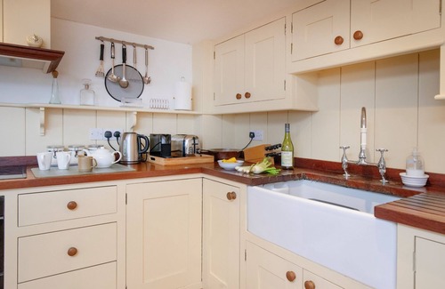 With electric oven and hob, microwave, fridge/freezer, and Nespresso coffee machine.