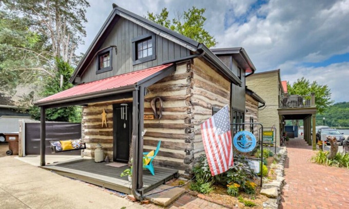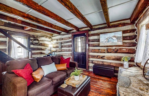 Experience the charm of Augusta, KY in this cozy 1800s log cabin guest quarters, just steps from the Ohio River. Perfect for up to 6 guests, the space includes one queen bed, one full bed, and a full sofa bed in the living room. The layout features a small living room, an upstairs kitchenette area with a bed, plus a connected room with a bed and adjoining bathroom.