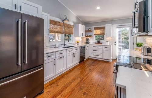 This fully renovated cottage features 3 bedrooms and 2 full bathrooms. The primary bedroom and on-suite overlook the large back deck with a spectacular view of Lake Norman right from the king sized bed. The kitchen is fully stocked with new KitchenAid appliances, pots and pans, toaster, blender, Keurig and ample plates and dishes for serving the family. There is also a propane grill on the back deck off the kitchen, for all your cookout needs. The living room features hardwood floors with massive wood ceiling beams and a beautiful gas log fireplace underneath the large 70" TV. One of the sofas in the living room is a sleeper sofa with plenty of room for extra guests. There is even a cozy dog cubby underneath the stairs leading up to the primary bedroom to allow for pets to have their own cozy space as well. The second bedroom is a spacious bedroom featuring a king size bed and two spacious closets. The third bedroom is the bunk room with a twin over twin bunk with a pullout trundle underneath. The second bathroom is conveniently located in the hallway between the bunk room and second bedroom. This bathroom is newly updated with beautiful white subway tile adorning the walls of the shower/tub combo, a dual sink vanity and large linen closet. The laundry room is equipped with a washer and dryer as well as a folding table and hanging rack with tons of storage. Lastly the huge back deck can be accessed from the kitchen, primary bedroom or from the sliding door off of the living room. There is an outdoor table and chairs for dining and cookouts as well as rockers, a sofa and chairs for outdoor gatherings with a beautiful view from every inch of the deck. The backyard is fully fenced to allow for guests fur babies to accompany them and join in on the fun that all the lake has to offer (please inquire for pet policy).