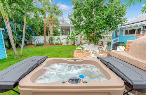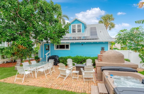 (NO POOL ACCESS. PRIVATE OUTDOOR SPA). Our Blue House is an off-site (200 feet from the Main Hotel Building) 1,750 square foot historic Sears and Roebeck Kit Home (built in 1915) located just steps away from the scenic Riverwalk along the St. Lucie River and the renowned shopping, dining, and entertainment of Historic Downtown Stuart. This luxurious and charming 2 story, 3 bedroom home sleeps up to 9 guests and features antique Florida heart-pine flooring and intricate wainscoting throughout the home; a living room with comfortable furnishings, a non-working fireplace, and exposed wood-beam ceilings; a fully-equipped kitchen; a dining room; a spacious front porch with pecky cypress wood ceiling and comfortable rattan furnishings; 2 ground floor bedrooms (one with queen-sized bed and the second with full-sized bed); a ground floor bathroom with shower; a spacious second story bedroom with 2 king-sized beds and a twin-sized sleeper sofa; a second story bathroom with tub and shower; a laundry room with washer and dryer; a spacious backyard with a private outdoor spa, adirondack chairs, a propane fire table, a swing set, a hammock, and an outdoor wood-burning pizza oven. Other features and amenities include: K-Cup brewer with assorted gourmet coffee & tea selections; Complimentary Wi-Fi Internet access; Luxurious microfiber bed linens; Plush Deluxe Mattresses and bath linens; Designer bath products (shampoo, conditioner, lotion, facial/body soap & makeup remover wipes; Guest information booklets with options for local dining, shopping and entertainment; Hair Dryers (Ionic 1875-watt); Nightlights; Luggage Racks; Multi-port charging station for devices; 2 Flat Screen Televisions with Comcast Cable; Steam Iron/Ironing Board; Complimentary on-site parking; Lush, tropical landscaping; and Outdoor Gas BBQ Grill.