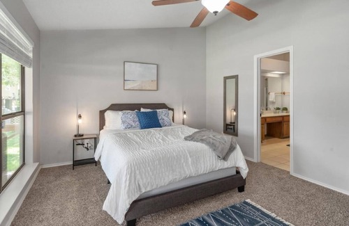 The master bedroom provides a queen size bed, attached bathroom. The room includes a dedicated workspace, TV, USB charging ports, and a comfortable sitting area to look out over the back deck and lakefront.