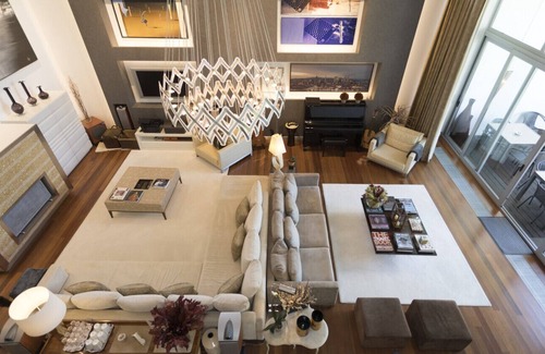 Downstairs, a huge central fire place is set in a metal encasement, around which comfortable sofas are positioned to create simultaneous feelings of togetherness and privacy.