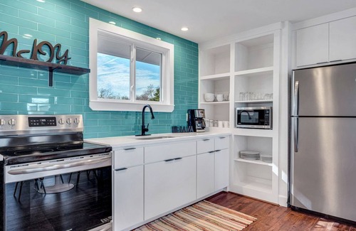 Mornings start off right with a breathtaking lakeside sunrise and coffee on your deck. Make breakfast in your full kitchen, which is well-stocked for real cooking! Eat outside on the deck, or at the 4-person mid-century modern dining table in the kitchen.