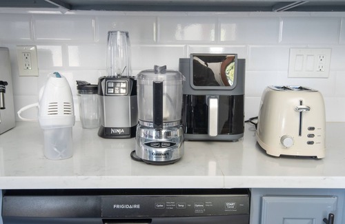 As you enter, you'll be greeted by a cozy living room and a parlor, each with their own (non-operating) fireplace and comfortable seating for 10+. The dining room features a beautiful solid wood table that comfortably seats 8 and a convenient half bath. The fully equipped kitchen boasts an island, a small breakfast table, and everything you need to cook up a delicious meal.