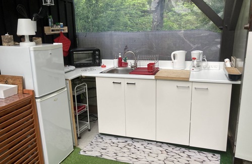 A fully equipped summer kitchen just like at home (2-burner electric hob, an oven, a coffee maker, a kettle, everything you need to make delicious meals and cakes. All the crockery, a fridge and a small freezer.