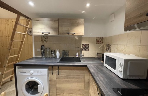 • An open, fully equipped kitchen: refrigerator, 2-burner induction hob, microwave, washing machine, Nespresso and filter coffee makers, toaster, kettle,