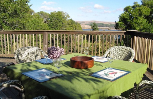 The Cliff House is situated on a hill above Tomales Bay. It is an open split level home with exposed beams and a huge great-room with amazing bay views. The beautiful master bedroom has a king size bed and attached full bath. It looks out through sliding glass doors over a large redwood deck with views of the bay. On the same level there is an additional 1/2 bath with a den next to it. The den has two twin beds. Downstairs there are two bedrooms and a full bath. Room #1 has two twin beds and garden views of the property and a view of the bay. Room #2 has a queen size bed and a twin bed and has a view of the bay. All rooms are appointed with comfortable bedding and have closets for storage (except the den).