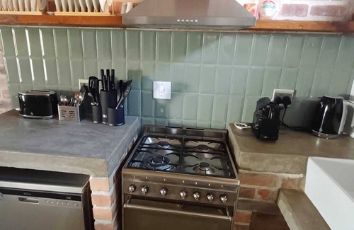 The light and airy open-plan living area includes a well-equipped kitchen with a fridge-freezer, gas stove, electric oven, microwave, cutlery, crockery, and tea- and coffee-making facilities. A breakfast bar with stools provides a casual dining space, while a washing machine and dishwasher add extra convenience. The lounge offers a comfortable L-shaped couch, a wood-burning fireplace, and a TV with a full selection of DSTv channels. Guests can also enjoy a collection of books and magazines for leisurely reading.