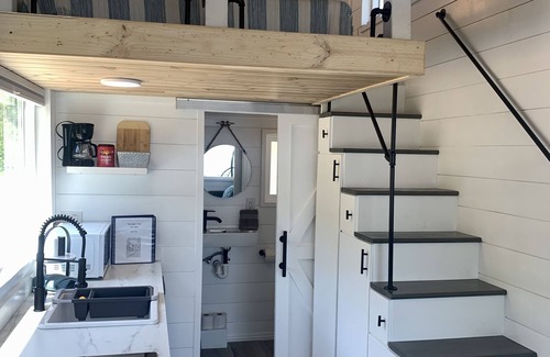 These Tiny Homes feature all the comforts of a standard home including Heat/AC, Kitchen, Bathroom, living room and sleeping loft.