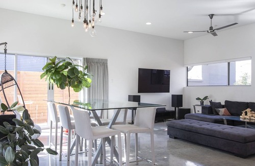 You want your next vacation home to have wow factor, and the Eastsider has plenty to offer. This beautiful modern home with contemporary interior design and seamless indoor-outdoor living is the perfect spot for your Austin, TX checklist. If that list includes staying in a private sanctuary tucked right in the middle of Austin's hottest attractions, The Eastsider can check it off. The State Capitol, Waterloo Park and amphitheater, Moody Center and basketball arena, UT Campus and football stadium, 6th Street District and Rainey Street district are all just a 10-20 minute walk away. And if that all seems too good to be true, you are also a 15-minute drive away from the airport.