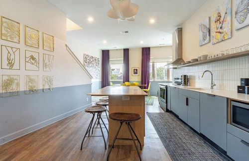Start your morning spinning records before heading into town, or sip coffee as sunlight fills the bright, colorful space. A plush queen bed invites you to recharge after a night on Broadway, while the vibrant bathroom doubles as your personal stage for getting concert-ready.