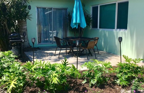 Welcome to the tropical themed Flamingo Casa, located on the Club Med Golf Course. It features 2 bedrooms, 1 bath, fully stocked kitchen, dining room and sitting room with outdoor courtyard, BBQ grill, laundry facilities, beach chairs, and covered parking. It comfortably sleeps 4. Pet friendly (20lb) or less. Minutes from shopping,dining, botanical gardens, beaches and downtown Stuart Fl. Owner occupied duplex. Private entrance, complete private space