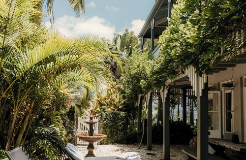 The living area encourages lounging comfort with a private courtyard for outdoor dining and two sunbeds to enjoy the luscious garden setting.