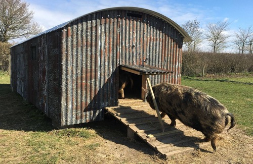 This gorgeous barn above the nursery stable invites you in from the farmyard up a dramatic reclaimed staircase and into a spacious living area in the eaves. The Grain Loft raises excitement levels with a walk on window overlooking the nursery stable below. Settle in by the logburner and, depending upon the time of year, watch freshly hatched chicks, Snowgoose goslings, Swiss Valais lambs or Boer kids arriving into the world. The floor is fully soundproofed so don’t worry about bleating keeping you up, you can enjoy the experience in perfect peace! The four handcrafted hay mattresses divided by stall partitions are a quirky and cosy place to put your head down after a day on the farm and the liberal use of sheep skins from our own flock create the charming feel of a beautiful Swiss chalet.