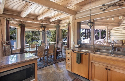 This beautifully decorated home with its spectacular views is unlike any other in Big Bear Lake. Located on a quiet cul-de-sac on Inspiration Point at the far reaches of Boulder Bay, the views are breathtaking from every direction. Expect an 'over the top' experience when staying in this home. The unique living space offers a cozy and comfortable cabin feeling. The beautiful full round hand peeled logs, the hardwood floors, granite counter tops and comfortable furniture boasts a true mountain home experience. The outdoor patio with fireplace is where you will probably spend much of your time enjoying the view and relaxing as you listen to the mountain sounds next to a crackling fire. The lower patio is a perfect place to relax in an Adirondack chair with your feet up as you watch the 'Pirate Ship' or 'Big Bear Queen' tour boats go by -- have your camera ready! If you are a sun worshiper, you'll enjoy the 3rd patio lakeside, or better yet, go ahead and walk out onto the dock to be even closer to all of the lake action -- fishing, boating, boarding, tubing, kayaking and swimming. As evening approaches, have your camera ready again because you will see some of the most beautiful sunsets ever.