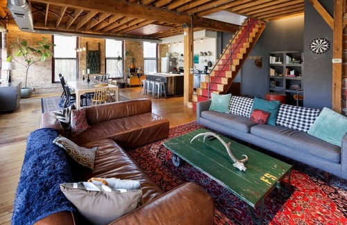 The Grand Kimball Lodge is filled with enormous windows, a large, open concept layout, and Wes Anderson inspired decor. Enjoy all that this vibrant neighborhood, Logan Square, has to offer, and then come back to The Grand Kimball Lodge to relax. This 5 bedroom + glamping tent and 4 bathroom rental comes equipped with 2 spacious kitchens and 2 separate living areas, so there's plenty of room for everyone!