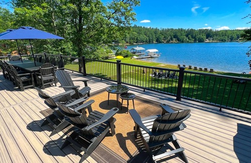 This beautiful escape from reality with direct lake access from the lower level allows you to unwind and relax. Also, you will have the convenience of 75 feet of lakefront property, which includes a large private dock and a walk-in area to the lake for swimming with a sandy beach bottom. Enjoy the beautiful Adirondack lake views from the custom-made fire pit with eight Adirondack chairs. Also included and attached to the house, in the garage is an indoor bar and game room which includes: a pool table, shuffleboard, and a dartboard with double sliding glass doors for all the lake views.
