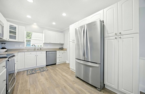 As you step onto the front patio with seating for two, take in the peaceful views before heading inside to unwind. The den offers a cozy couch and TV for casual relaxation, while the spacious kitchen boasts stainless steel appliances, crisp white cabinetry, and everything you need to prepare meals, enjoyed at the dining table for four. The living room is bright and inviting, featuring a smart TV, sofa with lounger, two chairs, and an additional sitting area for two by a large window overlooking the river, with direct access to the patio. For evenings under the stars, the screened-in back deck with a table for four creates the perfect setting for al fresco dining. The Heron House combines comfort, convenience, and classic Florida charm for a truly memorable stay.