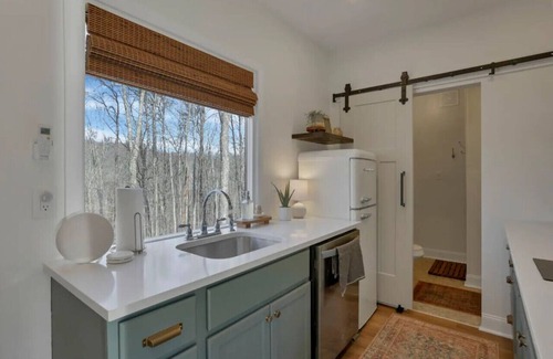 Step inside the Hillside Retreat and you`ll be greeted by a charming and stylish interior. The open floor plan includes a living area, kitchen, and bedroom with a queen bed, all thoughtfully designed to maximize space and comfort. The large windows flood the space with natural light and provide stunning views of the surrounding nature. A garage door opens up to a spacious patio, perfect for sipping your morning coffee while soaking in the peaceful surroundings.