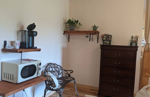 'The Garden' is our most luxurious and romantic room. It has a California King bed with a luxury brand organic cotton pillowtop mattress, along with premium organic cotton sheets, your choice of high quality memory foam or goose feather pillows, and a beautiful floral cotton quilt. The room has a fully stocked kitchenette with a mini fridge, microwave, and coffee maker, along with freshly ground coffee, cream, and sugar. This room also has the best view in the house, overlooking the beautiful open pasture from the second story.