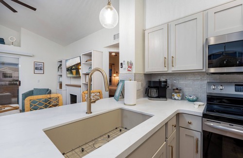 Enjoy a luxury stay with a high-quality interior design! This centrally located condo is within walking distance from the London Bridge, Rotary Park, and golf course. Our condo sleeps four and offers two beds(1 king and 1 memory foam mattress). Additional features include TV, free WiFi, electric fireplace, washer and dryer, walk-in closet, and more! The condo community has a pool, spa, picnic area, tennis/pickleball/volleyball court, and grilling area. Boat/RV parking within complex.