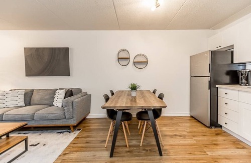 The Landing Pad is a newly updated cozy 625 square foot, ground floor condo unit that has been freshly painted and styled with new decor. This unit features 2 bedrooms and a large 4pc bathroom. The primary bedroom features a queen size bed with an adjoining bedroom that has a twin over double bunk bed.