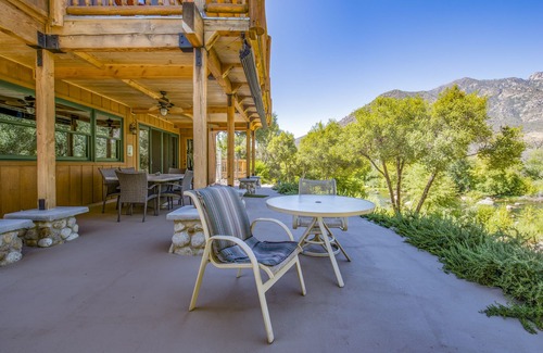 This riverfront cabin in Kernville has everything! The backyard is the river with a beach area, hiking, fishing, rafting, tubing, skiing, horseback riding, or just sit in the river with a beer and some friends! With sleeping space for 12, there is ample room for groups and families. Lake Isabella is 15 minutes away for added fun! Premium cable, high speed internet and wifi. 3,000 sq ft of living space and newly remodeled with a gourmet kitchen, giant bathrooms, an outdoor rain shower, and very comfortable beds, there is no other rental in the area that has these amenities and a sandy beach right out the backdoor.