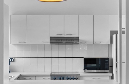 Fully equipped kitchen with oven, stovetop, microwave, dishwasher & coffee machine