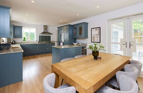 • Kitchen: Spacious kitchen with blue cabinetry, integrated appliances, and ample space for food preparation. Opens into a dining area with seating for six.