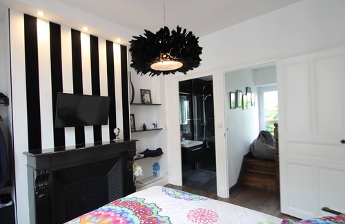 Overlooking a very cozy living room furnished with quality materials and elegant decor, a convertible sofa, stylish armchair, indirect lighting, its vintage cement tiles and marble fireplace gives a classic charm. The space is equipped with a flat screen wall mounted and unlimited internet. We also wished that the universe of the cinema of the Seventies "Tontons flingueurs and other comedies be present in the decoration.