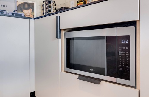 Start your morning spinning records before heading into town, or sip coffee as sunlight fills the bright, colorful space. A plush queen bed invites you to recharge after a night on Broadway, while the vibrant bathroom doubles as your personal stage for getting concert-ready.
