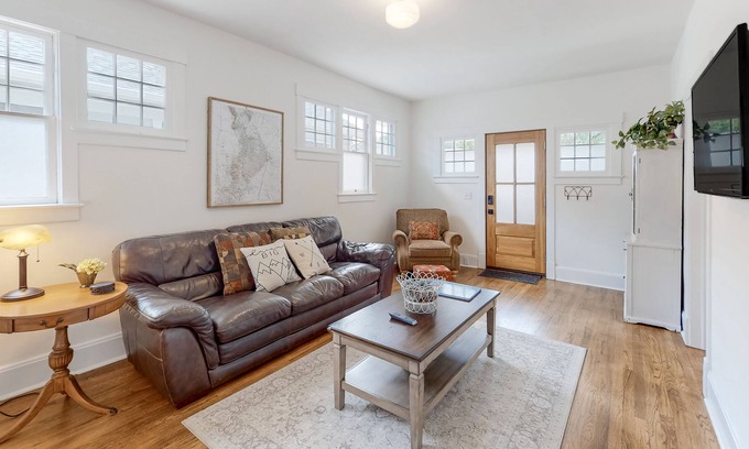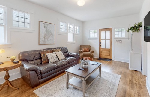 Just inside the front door of the first bungalow, take notice of the spacious living room's comfortable seating, mountain-themed mementos, and large TV. Steps away, the well-equipped kitchen features wooden countertops and stainless steel appliances. When it's time to eat, gather with your loved ones around the quaint dining table. The bedrooms and sizable bathroom make for effortless morning and night routines.