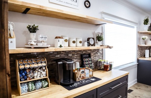 During your stay, enjoy access to shared amenities, including a fully stocked coffee and tea bar and a convenient mini kitchen with a refrigerator, microwave, air fryer, toaster, and electric griddle—ideal for preparing light meals or snacks. The cozy sitting area invites you to unwind with a good book or a refreshing drink after a day of adventure.