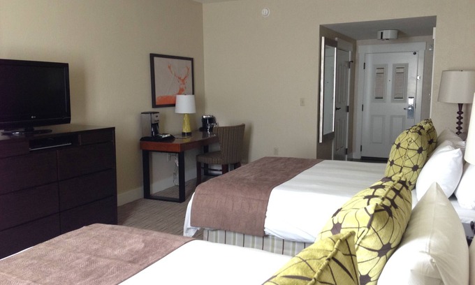 This one bedroom unit has two separate entrances. The bedroom view looks out over the pool and fun below. The bedroom enters into a mudroom area, with full bath on your right, with privacy door. There are two queen beds, a desk, a large chair, chest of drawers, TV, DVD player, coffee maker, and ice bucket. The closet includes a combination-lock controlled safe, and ironing board. Bathroom includes hair dryer and wall mounted magnifying mirror.