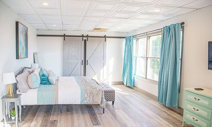 This newly furnished and updated apartment is located on the 2nd floor above commercial space. You must check out the views from the master bedroom, living room, and kitchen. Both bedrooms have King beds and the living room has a pull out sofa.