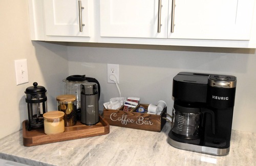 • Coffee bar with coffee mill, drip or K-cup maker, French press, and electric tea kettle