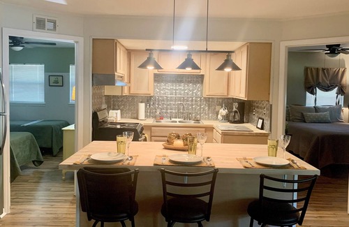 The fully stocked kitchen includes cooking utensils, pots & pans, linens, potholders, flatware, dishware, and glassware. There is a microwave, coffee maker, crock pot, toaster, air fryer and hot water pot. The huge kitchen island is a great spot to prepare your favorite meal. Bed linens and bath linens are provided along with soaps & shampoos.
