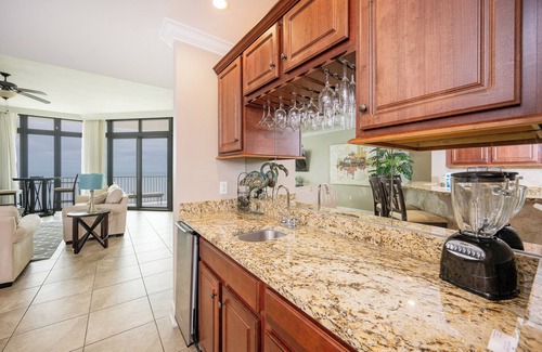 Open to the living room, the fully equipped kitchen features beautiful wood cabinets, a tile backsplash, expansive granite countertops, and stainless steel appliances. Your crew can keep you company at the breakfast bar, where there’s seating for four, and the family bartender can make drinks at the accompanying wet bar where there’s an additional sink, ice maker, blender, and assorted glassware. When it’s time to dine, gather in the elegant Gulfview dining room at the table for six.