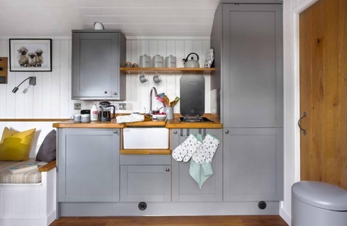 The interior of the hut is finished beautifully and is well-equipped with everything making it like a miniature home from home! With an open-plan living space, the neat fitted kitchen has a fridge, hotplate, butler sink and lots of storage space along with a wide variety of crockery, pots, pans and utensils. There's a cushioned seating area with a breakfast table, over which the generous king-sized bed neatly folds down for a great night’s sleep. The en suite shower room has a full-size shower, WC and basin and complementary sustainable toiletries are supplied.