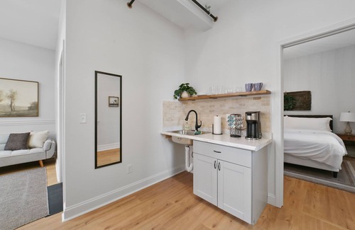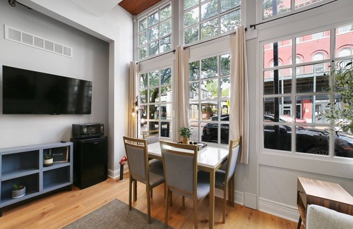 Wisdom and elegance define our accessible Owl Suite, the second largest accommodation in our collection. This thoughtfully designed space offers the perfect blend of luxury and convenience with its spacious layout featuring a separate dining area and comfortable living room. The Opulent Owl Suite proudly offers direct Main Street access through a private entrance, making it our premier ADA wheelchair accessible accommodation. Luxuriate in the sumptuous king-size bed or utilize the fold-out futon for additional sleeping space. From your windows, enjoy vibrant Main Street views placing you right in the heart of the action. The suite's crowning glory is its bathroom—the largest in the hotel—designed for ultimate comfort and accessibility.