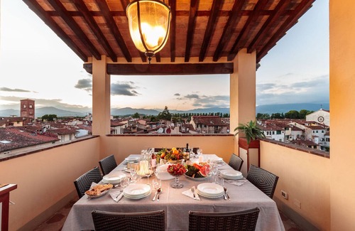 Staying true to its name, the PARK VIEW APARTMENT features a direct extensive view of the iconic garden of the Renaissance Villa Bottini from the terrace and each window. It is a sophisticated residence that showcases immaculate Italian opulence at its finest. Easily the most convenient location in the city thanks to its closeness to the train station and safe parking -both 5 mins walk away- a short, scenic stroll will land you among the most coveted spots: San Martino Cathedral, the instantly recognizable Anfiteatro and Via Fillungo, to name a few.Embrace the sights and sounds of Lucca from this contemporary apartment’s 4th-story terrace overlooking the roofs of the town. With a spacious dining area, the terrace is the perfect spot to enjoy a Nespresso or Bellini beneath the moonlit sky. When you are ready to explore the winding streets and medieval squares of Lucca, simple step outside, Piazza Anfiteatro, San Michele, Via Fillungo, Guinigi Tower and Piazza Napoleone are a 5-minute walk.Inspired by the old Italian noble homes, the PARK VIEW APARTMENT’s living room uses the subtle black as a refreshing accent colour, mixing it with soothing stone greys, whites and warm flooring. The PARK VIEW APARTMENT continues in the dining room, where you will enjoy historic city-views while you are having dinner. Moving to the kitchen, state-of-the-art appliances are ready to inspire your inner chef. Before heading out for the night, treat yourself with a soothing steam-bath in the spa-like master bathroom. Soaring ceilings open up the living space; natural light bursts in through French doors. Intricately detailed original old tiles add an artful element to the interiors, alongside plush details, such as velvet-upholstered furniture and drapes, and décor in a range of emerald, charcoal, and dusty rose hues. Four luxury master bedrooms with grand windows complete the PARK VIEW APARTMENT along with four bathrooms (two of which are ensuite). Air conditioning, elevator, a high-speed wifi connection are not missing. The Wonderful covered terrace for the guests’ exclusive use is reachable through elevator located in the building staircase just outside the apartment’s main entrance plus a short flight of steps which makes it ideal for at home dining with a chef and his staff.The neighbourhood is where you will find the legendary Anfiteatro and many of the city’s most famous architectural attractions. Make sure you have a camera with you all the time, especially when admiring the streets surrounding the apartment, as you will find Via del Fosso with its medieval water stream passing by the antique gates dating back to 1100s, Piazza San Francesco horned by its white Carrara Marble Romanesque façade and Lucca Train Station within 7 mins walk away plus a safe parking 5 mins walk as well. And, if you are hungry, you will find incredible Italian restaurants in every corner, but a great place where to start it is the Giglio One Michelin starred Restaurant or Gli Orti di Via Elisa. IMPORTANT TO KNOW: We think it is important to make known that during the summer months, from the end of June to September 5, in the park of the villa in front of the apartment (not exactly in front of the apartment but inside the park) an auteur film festival is held therefore films will be screened in the evening, also in English, and the screenings begin around 9 pm and end around 11.30 pm. Usually there are about fifty spectators, so from the apartment you could hear the buzz as well as the sound of the movies.