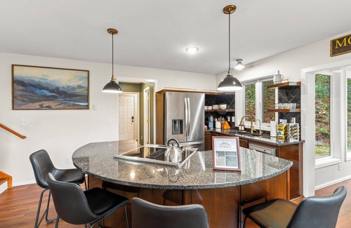 Step onto the expansive front deck, where you’ll find outdoor dining and a lounge area overlooking the forest. Inside, the stylish yet cozy living space features a wood stove—perfect for chilly nights or just a little ambiance. The renovated kitchen has brand-new appliances and is fully stocked for everything from full meals to trail snacks. Kick back and enjoy a nice meal together in the light-filled dining nook just off the kitchen!