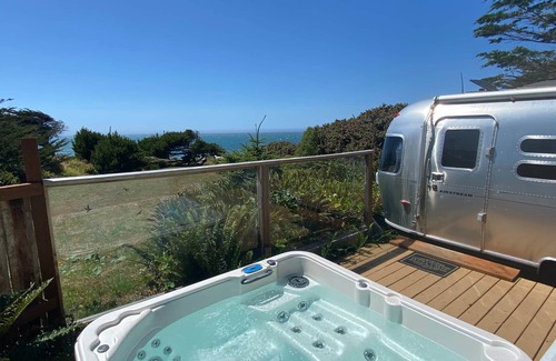 This Airstream offers a cozy, private space on a bluff overlooking the ocean. It has an open-plan kitchen, lounge, and dining area, a bedroom with a queen bed, a bathroom, and a shower. Enjoy a private outdoor space with a hot tub and fire pit.
