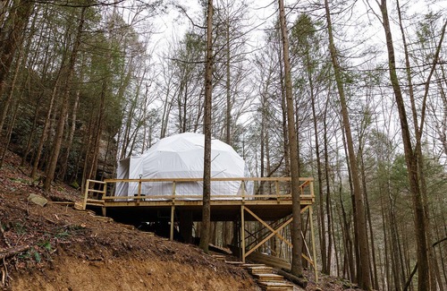 A rare, elevated stay in Red River Gorge, this property offers the perfect setting for an upscale glamping experience. This newly-built dome combines modern design with earthy textures- giving you a "home sweet home" type feeling. Bring your crew over the river and through the woods to our 26-acres of woodlands, with free access to Spirit Lake. Located 15 mins. from Natural Bridge State Park in Daniel Boone Nat. Forest. Come hike, climb, and explore the good ole' outdoors! *4WD VEHICLES REQUIRED*