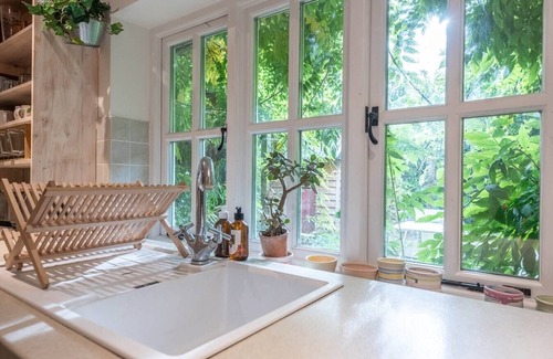 Well-equipped kitchen with oven, hob, extractor fan, fridge, microwave, kettle, toaster, sink and back door out to the garden