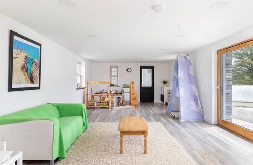 This holiday home is located in the beautiful Irish Country Side, with scenic and rugged views of fields, pastures and original stone walls of Clare, with Atlantic Ocean in the distance. We are just 10 minutes drive from Lahinch, popular for it’s surfing and golf. Only 5 minutes away from Miltown Malbay, where ’The Willie Clancy Festival’ is organised and you can experience unforgettable Irish Music. This newly build house is in the close proximity to the 300 years old renovated Kilfarboy farm house, surrounded by a big garden teaming with wild life and trees. You are welcome to pick fresh vegetables and fruit growing in the garden and polytunnel, also borrow a surf board if you fancy taking on the waves. Enjoy spacious, modern kitchen living and dining area with incorporated large ‘play area’ for young members of the family. If you are looking for a peaceful country escape or active family getaway, then we believe this property is going to fulfil your expectations.